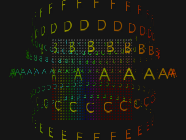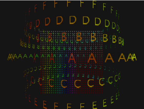 これはProcessingで制作したマウス操作型コンテンツです。マウスで文字を触ると回転の速度が変化します。大学のプログラミング授業で制作した作品です。