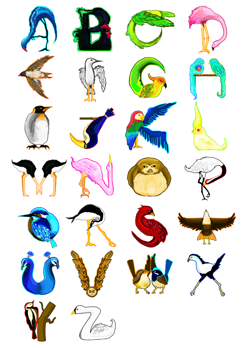 とりフォントです。大学のデジタルタイポグラフィという授業で制作した作品です。A~Zまでのアルファベットが全て鳥で出来ています。