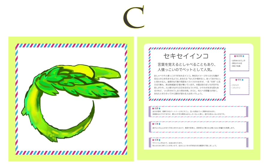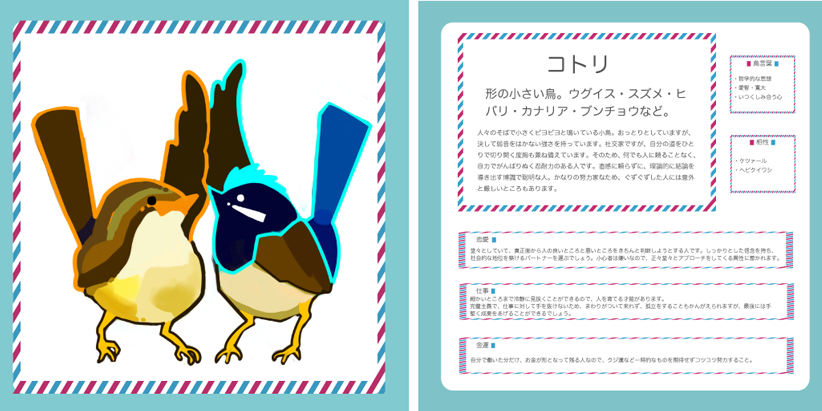 見ていて楽しくなるようなフォントを作ろう、と思ったのがきっかけでした。種類も実在する鳥の中から選び、ひたすらPhotoshopで描いていきました。占いの本というメディアに落とし込むことが出来たのは、個人的に大きな収穫だったと思います。