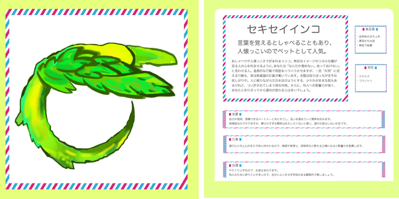 また同時に、実際にとりフォントを使って占える本「FORTUNE BIRD」も作りました。こちらは索引などもつけて、すぐに調べられるように制作しました。